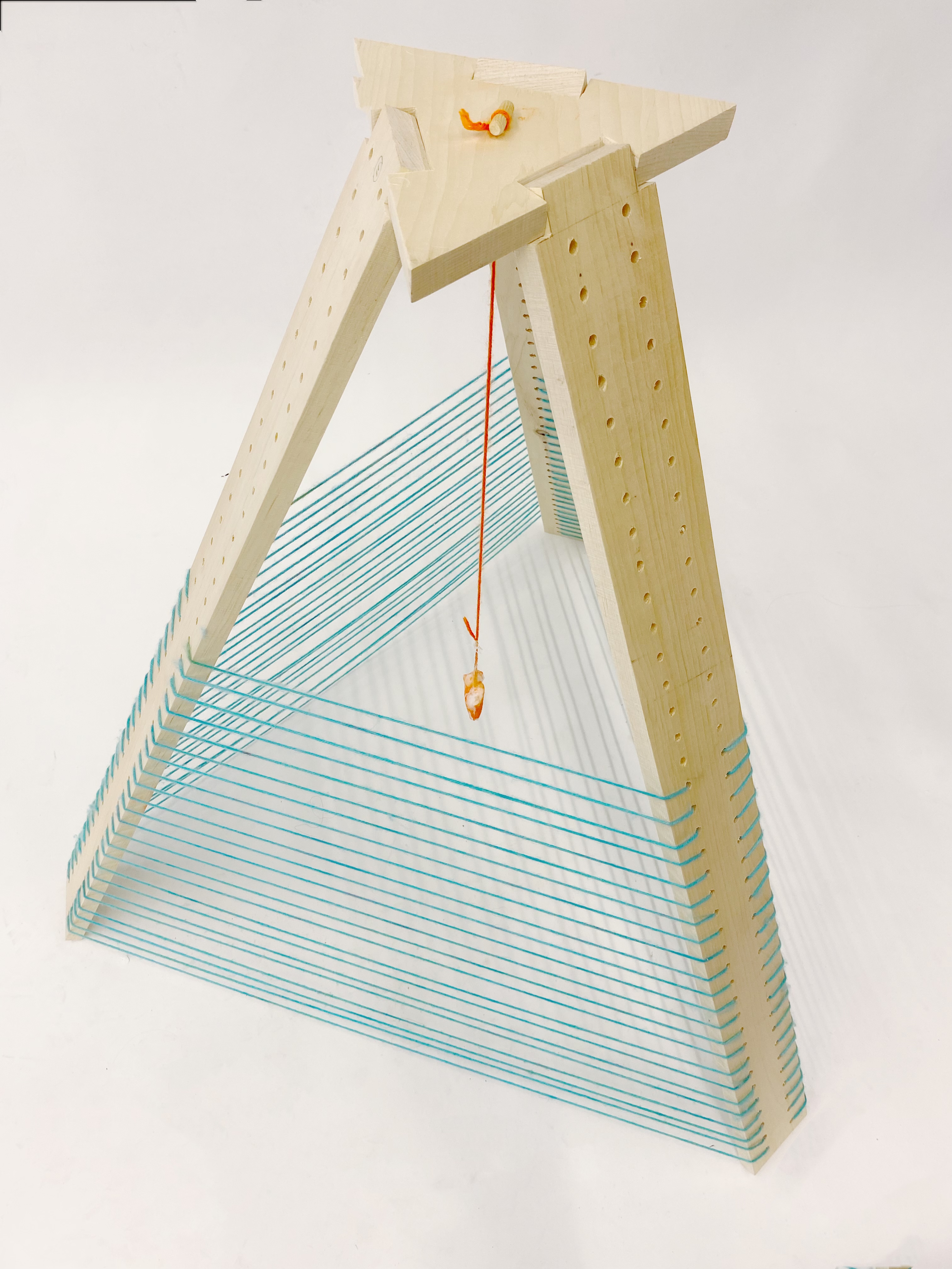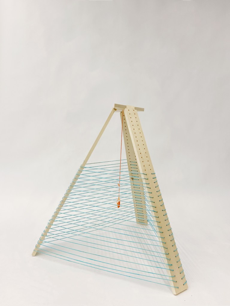 Time, Women, Pyramid is one of Donghui’s most recent wood sculptures. The artist was inspired by minimalism and try to create a space that traps something with minimal materials and meanwhile introduce the elements of time and female body. She uses three pieces of 40 inches wood panels attached with fine blue yarn and forms them into a pyramid shape. A piece of orange coloured tampon hangs from the triangle top of the sculpture. The stability of the whole structure relies on friction between the wood and the triangle top’s notch. During the creative process, the artist drills 78 holes in each wood panel and repeatedly threads them through the holes between each panel until the yarn has enough friction to hold the panels together. Then she attached a piece of coloured tampon in the middle. Females are given the power of breeding and continue the life of humanity, and yet we feel embarrassed if our period blood leaks on our pants in public. Lots of people on earth to this day still consider period as something sinful or embarrassing and trying to hide or avoid the fact that female period exists. There’s still women that can’t even afford tampons or period pads around the world. This sculpture revisits multiple triangles that represents the bonding, stability and mutual supports between the female bodies, nature and modern society.